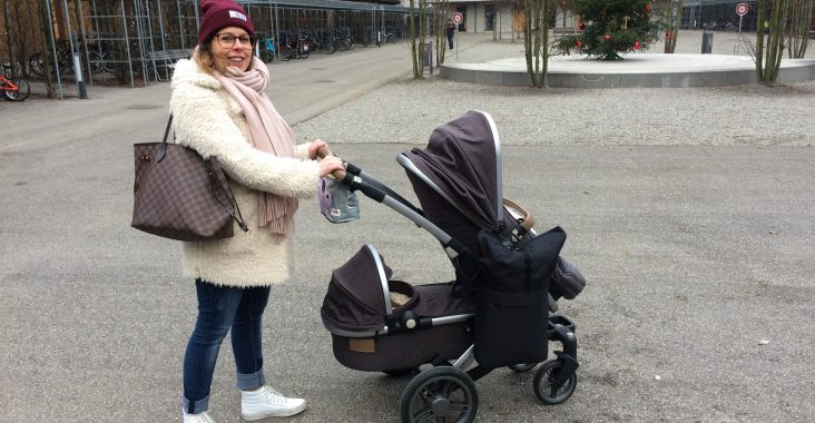 In the end I came across the Joolz Geo2 Duo. I knew this stroller because it kind of looks similar to the Bugaboo and the handle with its characteristic leather-look caught my eye several times before. What I did not know was that they made double strollers. We went to look at it in the store and it was all I needed (except a basket to throw my stuff in but there was an acceptable solution). The seat for the older child was big enough and tiltable. The Baby basket could be made into a small seat and it also came with accessories like a buggy board and a big basket once the older child would be able to walk or stand throughout the day. And – most importantly – it also came with a cupholder, yeah. I was safe! It was easily foldable and VERY compact and rather lightweight for a double stroller! We ordered it right away and when it finally arrived we put it in our stroller and bicycle storage room until the baby arrived. Now the sad part of the story: We left the hospital with Baby Kenzie on Christmas Eve day, only to find that our stroller had been stolen while I was at the hospital! Man, that person must have a f**d up karma, stealing a stroller on Christmas! So we went to the Police, filed a report and got a new one (number 5) payed by the insurance.